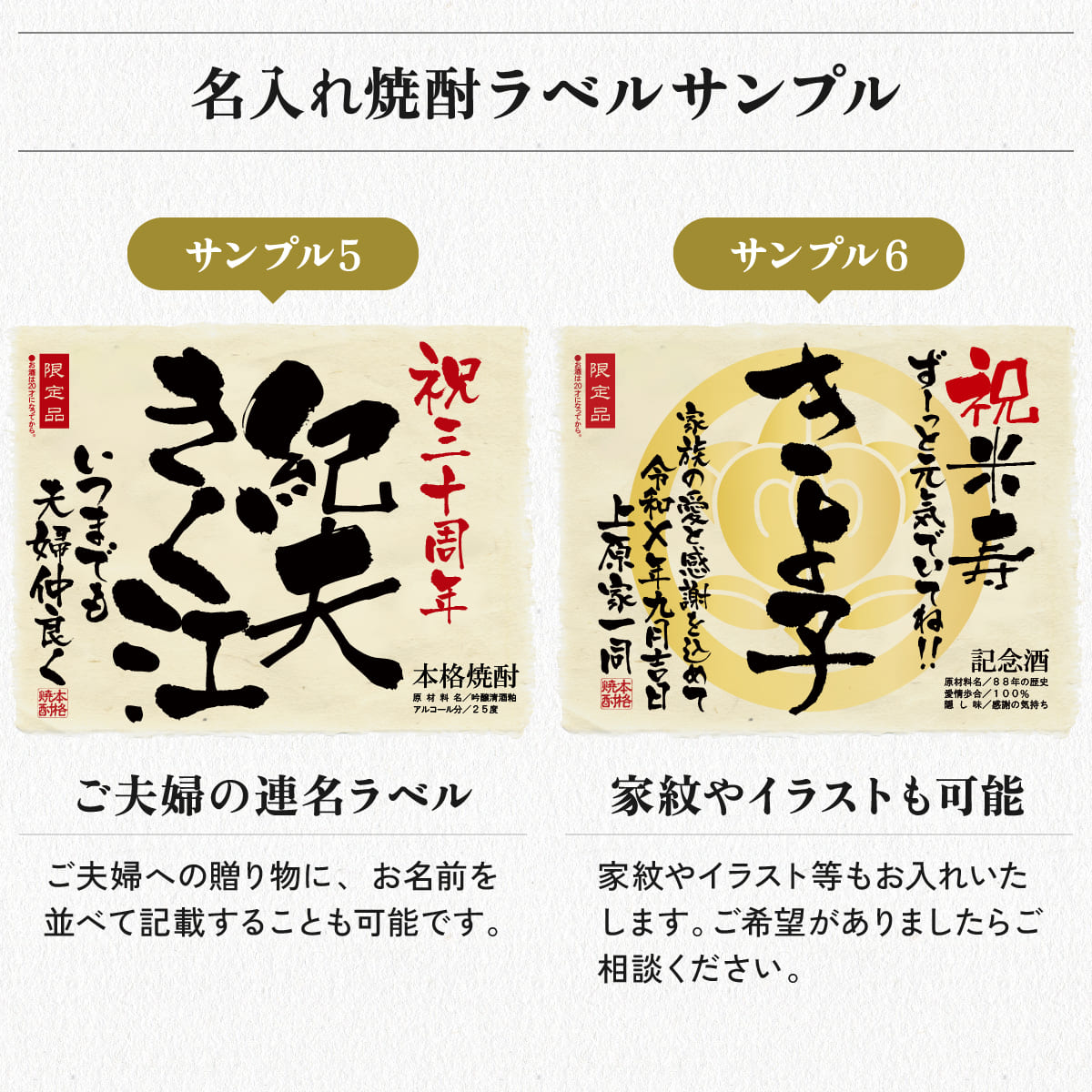 例|お名前、祝米寿、◯◯の酒、等